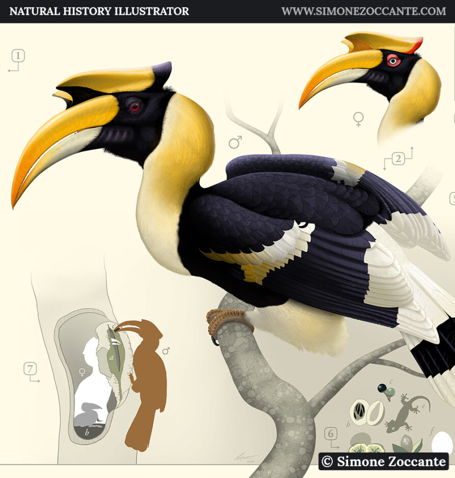 Zoological table of Great Indian Hornbill (Buceros bicornis) – Linnaeus, 1758. GREAT INDIAN HORNBILL Year: 2022 Client: Simone Zoccante / Diorama Nature Award: 1 of the 40 selected pieces for “Concurso Illustrasciencia 2022” (page of the artwork on Illustrasciencia website) Software: Adobe Photoshop Dimension (for Print): 260 x 185,3 cm @ 300 dpi Dimension (in…